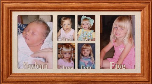 Newborn ~ Baby's First Five Years Fruitwood Stained Solid Oak Frame with Laser cut Cream Marble Insert Mat.A gift any new mom would LOVE to have to hold those precious first five year photos!! Frame Holds 2-full size 4"x6" photos or 2-cropped 5"x7" photos and 4-2"x3" wallet photos. Actual photo opening dimensions are: 3 3/4"x 5 3/4" and wallets 1 7/8"x 2 7/8".Overall Outside Frame Dimensions: 9" x 16".