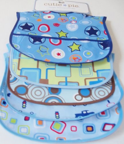 5-pack of waterproof bibs by Cutie Pie. Assorted designs for a baby boy.Velcro closure for easy on and off.100% polyester fabric is waterproof, stain and odor resistant . Wipe clean or machine wash - dries quickly. Lead-free, vinyl-free, phthalate-free, PVC and BPA free.